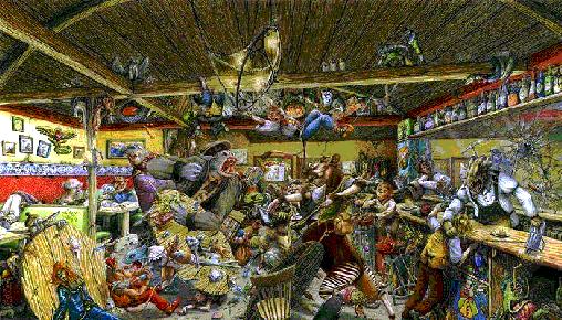 Efecto del Grog Orco en los parroquianos de la Taberna del Pueblo en el Distrito Reptante poco antes de que llegara la milicia para impartir el orden a porrazos.... |
